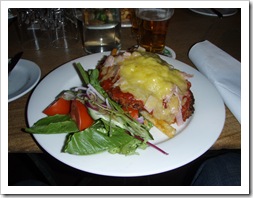 The salad was good, nice fresh greens and an almost whole tomato, it's about time. Negative points went to the long sprout like things which were difficult to pick up and eat after throwing back a few pints.
