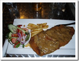 Outside even though it was 8pm, boy was I working up a sweat just sitting there. Half a star off. Apart from the extremely hot weather the beer garden was a gorgeous place to eat on a warm night. Service was a little slower than I would have liked considering the lack of patrons but the meal was worth the wait. I had a beef schnitzel with the much raved about mushroom sauce. The sauce did its fans justice and was full of mushroom flavour. A true mushroom sauce rather than gravy with mushrooms thrown in. The schnitzel itself was well proportioned, well breaded and perfectly cooked. Every mouthful was a joy to eat and the chips were crisp and seasoned with a wonderfully sweet flavouring which was perhaps a tad strong in parts.